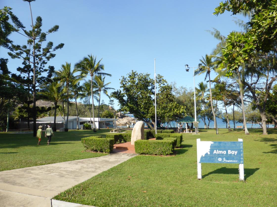 Alma Bay is a picturesque bay, just 150 m wide. It has two prominent granite headlands running out for 300 m on either end of the beach. Large granite boulders fringe the beach. The main Magnetic Island road runs past the back of the beach, with a foreshore reserve between the road and the beach.