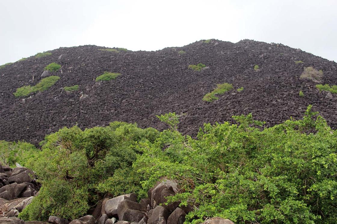 Black Mountain was once a body of hard granite rock that has been fractured and exposed over millions of years - other material was washed away exposing the boulders. This rock is actually grey and the dark appearance is due to a film of microscopic blue-green algae growing on the exposed surfaces - I have never seen anything like it.