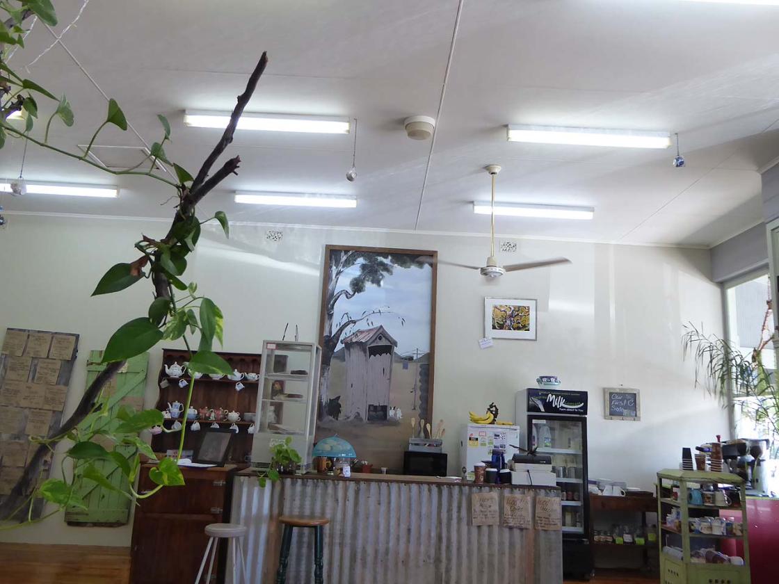 The cafe has plenty of seating with lovely tables nicely spaced out to allow plenty of room for diners. There are teapots and teacups hanging from the ceiling, paintings around the walls for sale and number of old wares on display around each room. Out back is a large shed full of second hand goodies for sale accessed past, the dog, parrot, toilet and funky garden - just beautiful.