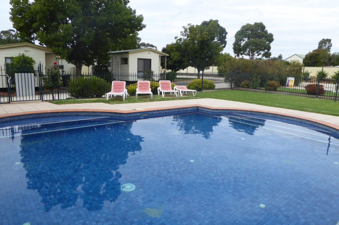 The park seems to be surrounded by relatively new fencing and the gardens are neat and tidy. A pool sits near reception and the entrance to the park which features a heated spa. This is a welcoming area surrounded by grass and plenty of seating options with lovely shrubs planted around the outside. Looks inviting.